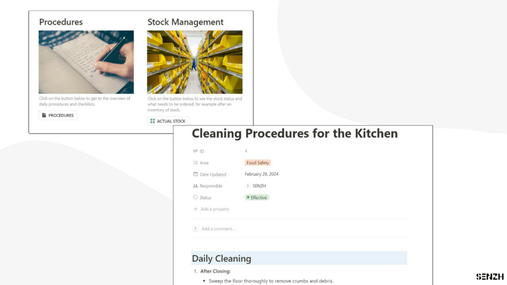 Hosted on the user-friendly Notion platform, your business is now fully digital, online or offline. Access checklists, recipes, and procedures from any device, anytime, and empower your team with real-time information.